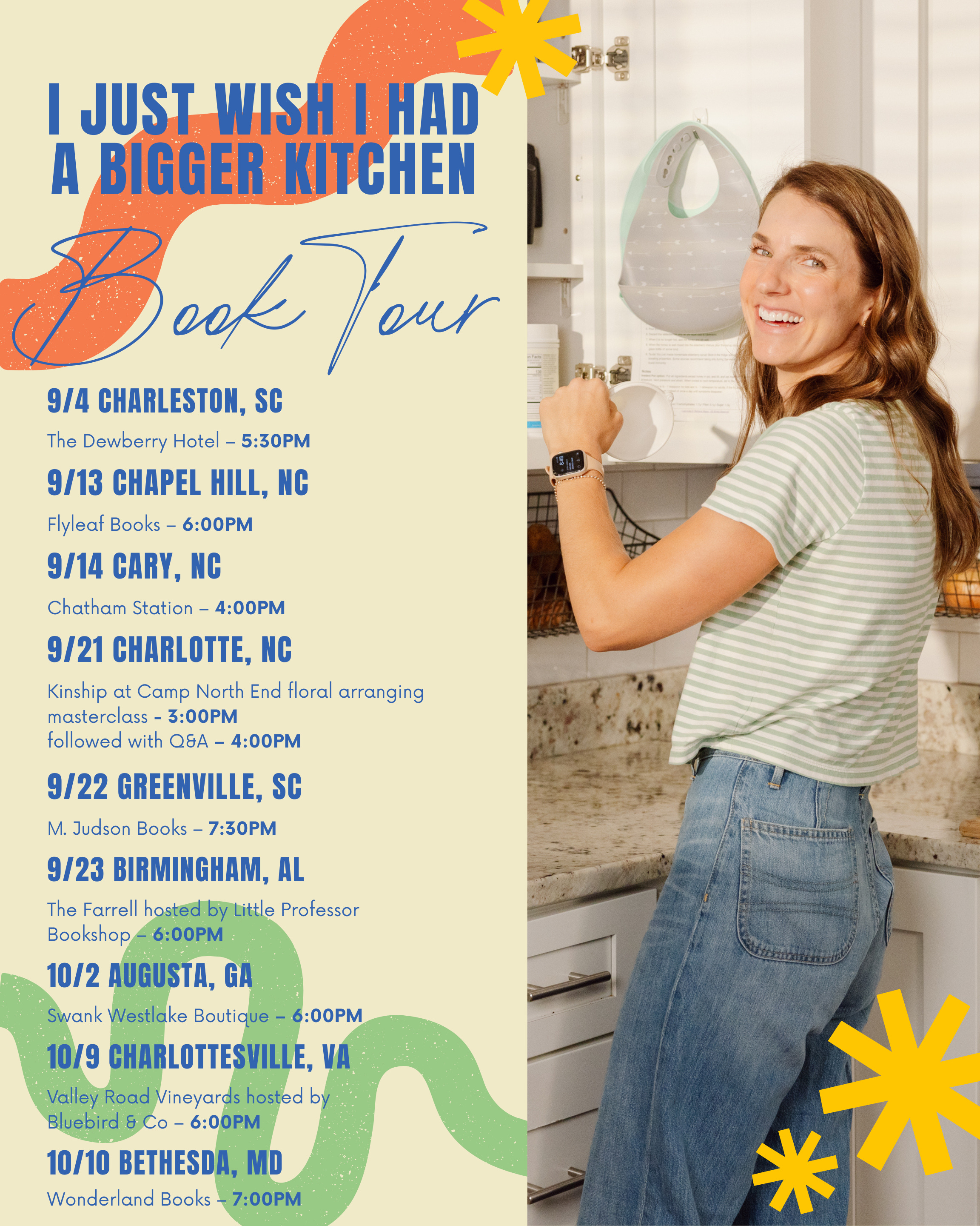 Hello! It’s here! I’m so excited to share that the I Just Wish I Had A Bigger Kitchen Book Tour is LIVE—and tickets are now on sale! I can’t believe I will get to meet so many of you in person this fall. You’ll find all the dates, times, and locations on the flyer and all of the events with links for tickets below!