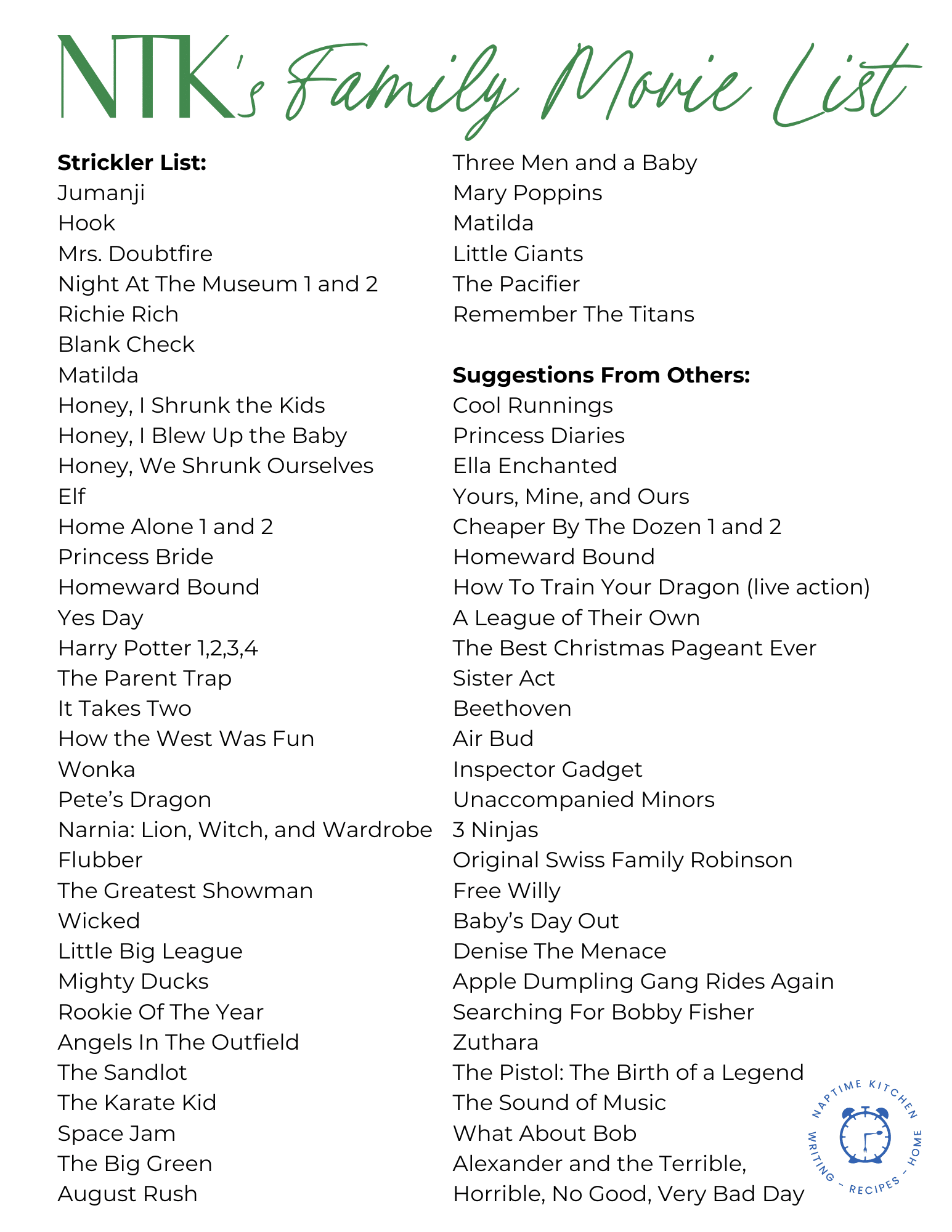 You all did not disappoint with suggestions for the Family Movie List. Here is the new list with recommendations from the Naptime Kitchen community: