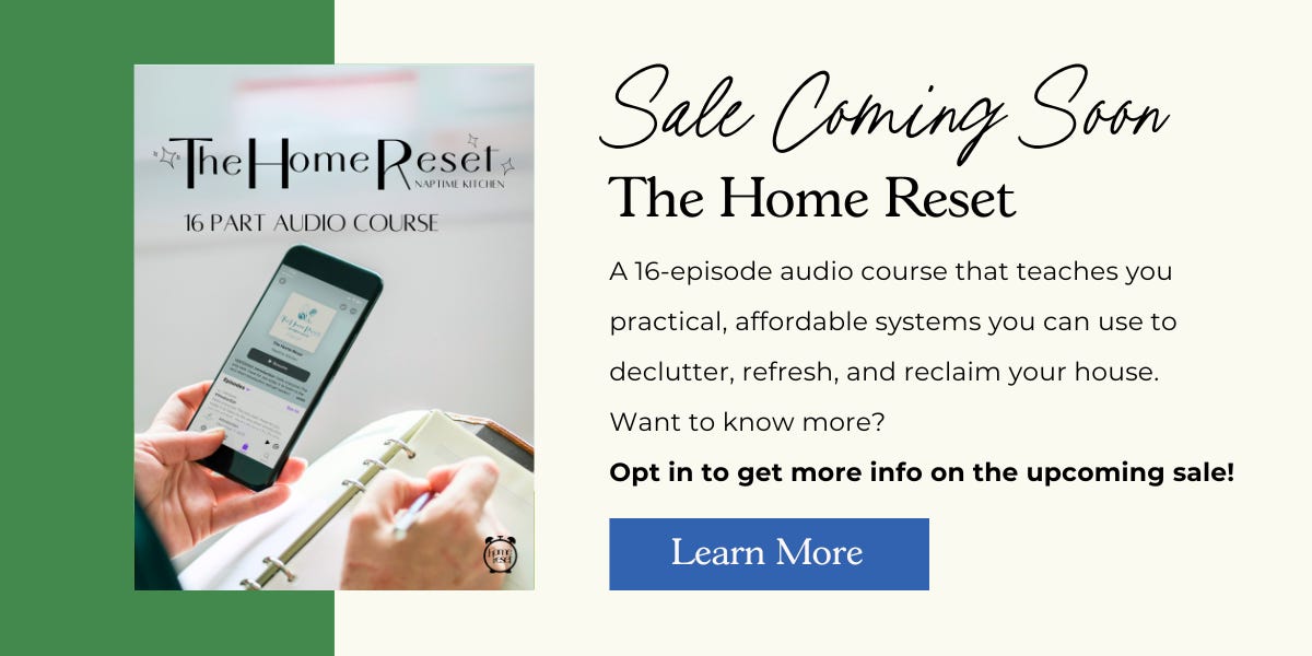Guys I am SO excited to do The Home Reset this year. Maybe it’s the excess clutter that comes with December, but I am itching to get to work on continuing to make our home serve us in our current season of life. If you’re new, I created this audio course back in 2020 (and re-recorded/added episodes last year!) to reset all the chaos that slowly creeps into our homes. I have been doing it bi-annually with you all ever since! Mind you, this is not just about decluttering; this is about changing the very foundation of how you think about your home. Twice a year I put it on big sale and starting January 1 it will be 25% off!!! If you want to know more about what it is and stay updated with the sale period, click below! You can also read more here.