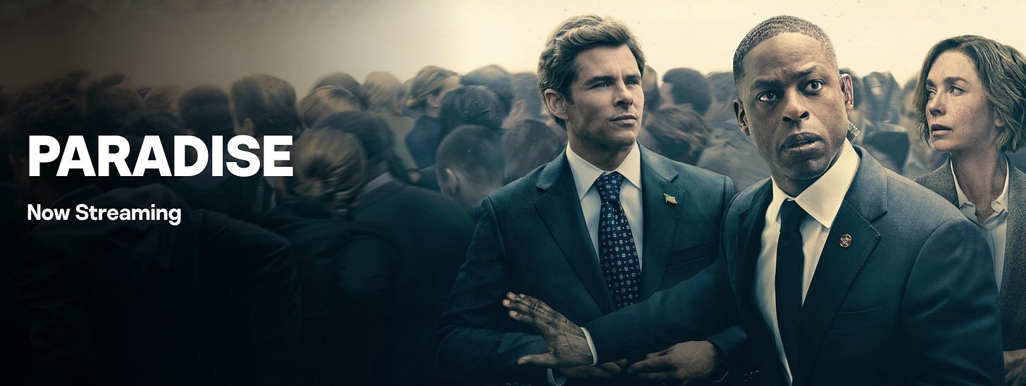 Kate here. I am working on an upcoming newsletter all about things I am consuming (spoiler: it’s basically zero books and a crap ton of TV and recipes)…but I need to just make sure we are all caught up on Paradise. I LOVED this show. Can’t stop thinking about it. Huge twist at the end of episode 1. The soundtrack. Thrilling but not overly scary. STERLING K. BROWN AND JAMES MARSDEN?! please watch it (on Hulu).